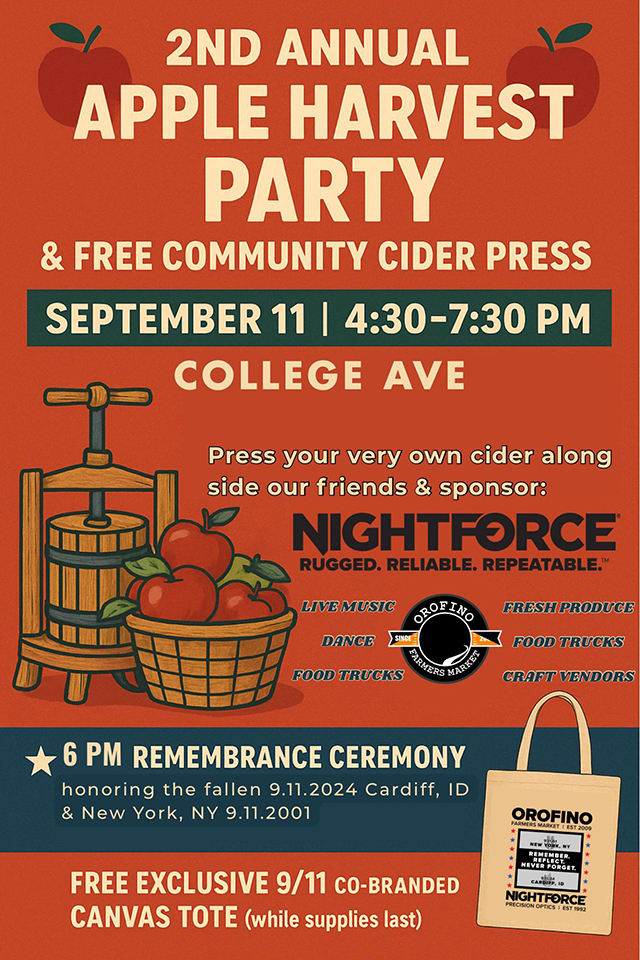 Apple Harvest Party Sept. 11 at Orofino On Thursday, September 11, the Orofino Farmers Market (OFM) will shift locations from the Orofino City Park into the downtown area on College Avenue, between Johnson and A street, for our season finale - the Second Annual Apple Harvest Party & Free Community Cider Press. The event will start at this year’s normal Farmers Market time of 4:30PM and extend an extra hour, ending at 7:30PM. At 6:00PM, we will also have a special 9/11 Remembrance Ceremony. Bring your own apples or buy some from Wilson Banner Ranch, and other participating vendors, to press your very own cider alongside our friends and sponsor Nightforce Optics. Cider containers will be provided and Nighforce will also be giving away an exclusive 9/11 co-branded canvas tote, while supplies last, to carry your cider and market goodies. Missing Parts will join us from Idaho County to entertain us with acoustic country, blues, and blazin’ harmonica music. In addition to the local downtown restaurants, specialty food vendors Mariana’s Tamales, Bob’s Caribbean BBQ, Hot Box Pizza Idaho, Tabby’s Bubble Waffles & Ice Cream, and Winnie’s Coffee will, again, be joining us. There will also be an assortment of vendor booths to shop, with artisan craft items, fresh local produce, baked goods, and sweet treats. Come say “farewell and see you next year” to your favorite OFM vendors. Not ready to say good-bye to your favorite OFM vendor just yet? Check out RekoHub on our website at www.orofinofarmersmarket.org/reko-hub to find and shop with participating OFM vendors year-round. At 6:00PM, our local first responders will help lead our 9/11 Remembrance Ceremony in a siren salute and moment of silence, to honor the fallen of 9/11 (both 9.11.2024 in Cardiff Idaho and 9.11.2001 in New York City, NY). To give back to and support our community, OFM will also be accepting donations during the Remembrance Ceremony to support local veteran-affiliated resources and services. The Orofino Farmers Market is a volunteer-led nonprofit powered by passionate locals who care deeply about food, farming, and this town we call home. Our mission is to support local agriculture and small businesses, strengthen community relationships, and provide access to fresh, seasonal, and locally produced goods. Additional information is available on the OFM web site at www.orofinofarmersmarket.org. ![]() |
