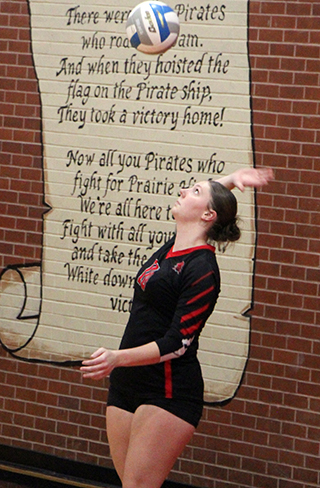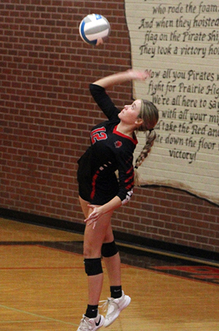 Kylie Schumacher scored a sideout kill. Avery Riener then served 6 aces and added a second touch kill for an 8-1 lead.An ace by Sierra Oliver made it a 10-2 lead. Beka Schumacher added 2 aces to make it 15-6. Avery Riener served 2 more aces to make it 20-8. A sideout kill by Mia Anderson and an ace by Kylie Schumacher made it 24-10. After a missed serve, Kendrick missed their own serve to give Prairie the set. The second set started out back and forth. A sideout free ball by Avery Riener gave Prairie a 5-4 lead. A kill each by Avery Riener and Harlee Hansen made it 7-4 and an ace by Beka Schumacher made it 8-4. Prairie kept the lead at 2-4 points until a kill by Kylie Schumacher sent Sierra Oliver to the service line at 13-9. Oliver served 5 aces and Kylie Schumacher added a kill to make it 19-9. Kendrick however answered right back with 9 straights points to get within 1 at 19-18. A block by Anderson finally ended their run. Kylie Schumacher then served out the set for Prairie. She had 2 aces while Oliver had a back row kill and Beka Schumacher had 2 kills including the set winner. Kendrick took a 1-5 lead in the third set. Prairie didn’t take their first lead until Kylie Schumacher went back to serve after a bricked serve by Kendrick that made it 3-6. A tip by Anderson, 3 aces by Kylie and a kill by Beka Schumacher made it 8-6. Kendrick came right back with 5 straight to retake the lead at 8-11. Prairie was able to tie the score at 11 after 2 aces by Anderson and again at 13, 14 and 15. A block by Kylie Schumacher gave Prairie a brief lead at 16-15. After Kendrick tied it again, another blocky by Kylie put the Pirates back on top. Oliver added 2 aces and Kylie a kill to make it 20-16. After 2 sideouts, Kylie Schumacher served an ace to make it 22-17. After 3 more sideouts, a kill and then an ace by Beka Schumacher gave Prairie the match. Kylie Schumacher had 11 kills, including 2 blocks, with 2 assists and 8 aces. Beka Schumacher had 9 kills and 5 aces. Avery Riener had 4 kills, 12 assists and 8 aces. Anderson had 4 kills, 4 assists and 2 aces. Kennedy Riener had 4 kills and 2 assists. Oliver had 2 kills, 2 assists and 8 aces. Kylee Riggers had 1 kill and 1 assist. Hansen had 1 kill and Capri Hagen had 10 assists. Vs. Grangeville In the match against