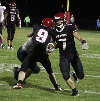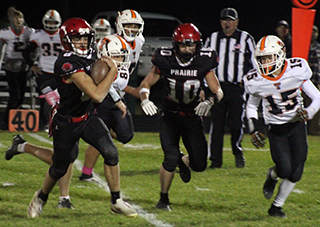 Pirates win big on Senior Night The Prairie football team won 76-28 over Troy on Senior Night Friday, Oct. 17 at Cottonwood. Seniors Levi Gehring, Max Rehder, Chris Schumacher, Levi McElroy, Ben Secrest and Oliver Kauffman-Van Houten were all honored with their families prior to the game. ![]() Prairie received the opening kickoff and started at their own 45. After a false start penalty on their first play, quarterback Kade Quintal tossed a short pass to the left to Schumacher, who went 51 yards to set up first and goal at the 9. After an incomplete pass, Schumacher took the ball up the middle for 9 yards and the game’s first touchdown. Gehring ran in the 2-pointer. Troy’s first possession was 3 incomplete passes and a punt. Prairie took over on their own 20 after the punt went into the end zone for a touchback. Gehring had a pair of runs totaling 16 yards for a first down at the 36. Quintal then passed down the left side to McElroy for a 44 yard gain to the Troy 20. On second and 8 at the 18, Quintal passed to McElroy for 13 yards but the play ended with a fumble that was recovered by Troy. The Trojans were again forced to punt with Ashton Martin blocking Troy’s punt. Payton Stamper picked up the ball at the 8 and returned it to the 3. On the next play Quintal ran a sneak for the touchdown. Gehring added the 2-pointer for a 16-0 lead. The Trojan s started their next possession at their own 45. An 11 yard run with a late hit penalty moved the ball to the Prairie 29. Troy quarterback Payton Christensen was sacked for an 8 yard loss but 2 plays later connected with Lincoln Marone for 37 yards and Troy’s first touchdown of the game. Troy tried to kick the extra point but Secrest blocked the attempt leaving the score at 16-6. Troy’s onside kick attempt went out of bounds at the Troy 49 and Prairie took over at the Troy 44. On second and 10, Gehring picked up 23 yards on a run to the right. Schumacher picked up 6 on a reverse. Gehring picked up 10 up the middle to set up first and goal at the 5. Gehring then took the ball around left end for the touchdown. Quintal ran in the 2-pointer for a 24-6 lead. Troy started on their own 37 and wound up punting on fourth and 17. Prairie took over at their own 34. Quintal passed to Schumacher for 20 yards. On the next play Quintal kept the ball and gained 24 yards to the Troy 22. Schumacher ran the ball into the end zone on the next play. Quintal passed to Stamper for the 2-pointer to make it 32-6 with 1:25 left in the first quarter. On the ensuing kickoff, Prairie was called for a 15 yard penalty that set the Trojans up at their own 48. They converted a fourth and 4 with a 26 yard pass to the Prairie 20. On third and 11, they completed another passed from Christensen to Jayden Mason for 21 yards and a touchdown. The 2-point run was stopped short and Prairie now led 32-12. Troy recovered their onside kick at the 50. On second and 10, Martin sacked Christensen for a 14 yard loss. After an incompletion Troy punted with Gehring catching the punt and going right then handing off to McElroy coming the other way for a 12 yard return to the Troy 46. On the next play Gehring went up the middle then cut to the right and went 46 yards for the touchdown. The 2-point run came up short leaving the Pirates with a 38-12 lead. Lane Mader’s kickoff checked up at the Troy 4 yard line and was returned to the 7. An encroachment penalty moved it to the 12. Martin then sacked Christensen for a 10 yard loss. On the next play Stamper tackled the Troy runner in the end zone for a safety to make it 40-12. Troy kicked off from their 20 following the safety and Gehring returned the kick 26 yards to the Troy 20. Troy was called for encroachment but Quintal was then sacked twice for 24 yards in losses back to the 39. He ran a keeper and gained 15 but a holding penalty cost the Pirates 10 of those 15 yards. Facing third and 24 from the 34 yard line, Quintal passed to McElroy down the left side. McElroy juked a couple of defenders and carried the ball into the end zone for a touchdown. Gehring ran in the 2-pointer to make it 48-12. Troy’s next possession started at their own 30. A chop block penalty set them back to the 15. Christensen lost 7 yards after a fumble on the next play but Prairie was called for a 15 yard penalty to moved the ball out to the 23. After 2 incomplete passes, Troy was called for a penalty that set them back to their own 12. On the next play Christensen passed downfield to Marone who broke free from a couple of would-be tacklers and went 88 yards for a touchdown. Troy added the 2-poiinter to make it 48-20. They tried another onside kick but Secrest recovered the ball at the Prairie 44.