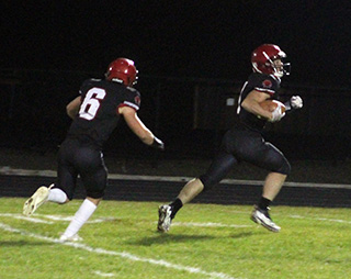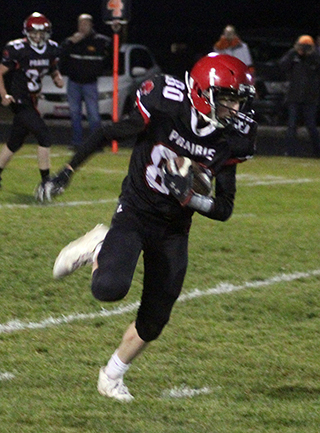 Quintal gained 13 yards on a keeper to the left. After a false start penalty, Quintal passed deep down the left side to McElroy who went 48 yards for a touchdown. The 2-point pass fell incomplete as Prairie now led 54-20. Troy’s next possession started at their 35. Trajan Elven sacked Christensen for an 8 yard loss. After 2 incomplete passes they punted. The punt went straight up and wound up going just 13 yards as Prairie took over at the Troy 40. A false start penalty set them back to the 45. On the next play Quintal passed to a wide open Schumacher for a 45 yard scoring play. Quintal ran in the 2-pointer to make it 62-20. Troy was able to move the ball to the Prairie 36 before time ran out in the half. The entire second half was played with a running clock. Prairie kicked off to start the second half and Troy took over on their own 23. On the first play Christensen fumbled with Martin recovering the ball at the Troy 13 yard line. An illegal block on the Pirates first play set them back to the 15. Quintal then passed to Gehring for the touchdown on the next play. Prairie tried a kicked extrapoint but it was blocked leaving Prairie with a 68-20 lead. Troy took over at their own 30 after the kickoff return. After 2 incompletepassed, Gehring intercepted Troy’s third down pass at the Prairie 40. On the first play after the turnover, Prairie ran a special “Max” play as Quintal passed to senior lineman Max Rehder on a guard eligible play for 17 yards. Stamper then ran for 14 and Schumacher picked up 23 to set up first and goal at the 6. Stamper ran 3 yards up the middle and on the next play he scored on a 3 yard sweep to the left. Another senior lineman got the chance to carry the ball as Secrest ran in the 2-pointer to make it 76-20. The kickoff turned out to be the final play of the third quarter. Troy took over at their own 43 and moved the ball downfield against Prairie’s backup defenders. They scored on an 18 yard pass from Christensen to Jayden Mason. They added the 2-pointer to make it 76-28 with 6:35 to play. Prairie sent their JV offense out for the next series and Sam Rehder’s fourth down pass to John Seubert came up 4 yards short of a first down giving Troy back the ball with less than a minute to play. Troy ran 1 play before time ran out. Prairie gained 203 yards rushing on 23 attempts. Gehring had 108 yards on 7 carries with 2 touchdowns. Schumacher added 52 yards on 5 carries with 2 touchdowns. Quintal completed 9 of 12 passes for 287 yards and 4 touchdowns. Sam Rehder completed 1 of 2 passes for 14 yards. McElroy caught 4 passes for 139 yards and 2 touchdowns. Schumacher caught 3 for 116 yards and a touchdown. Max Rehder caught 1 for 17 yards. Gehring caught 1 for 15 yards and a touchdown. Seubert caught 1 pass for 14 yards. Troy was held to -47 yards rushing on 20 attempts. Christensen completed 11 of 28 passes with 1 interception for 230 yards. Marone caught 3 passes for 129 yards and Mason caught 7 for 90 yards. Defensively Stamper had 8 solo tackles and 1 assist. Martin had 3 solo tackles, 1 assist, 2 sacks and 1 blocked punt. Gehring had 3 solo tackles, 2 assists a sack and a fumble recovery. Elven had 4 solo tackles and 2 sacks. Secrest had 1 solo tackle, 1 assist and 1 blocked extra point. Mader and Sam Rehder each had 2 solo tackles. Schumacher and Seubert each had 1 solo tackle and 1 assist. Cooper Riener, Max Rehder and Carson Lockart each had 1 assist. Prairie is now 6-2 on the season and 4-2 in league play. They close out the regular season this Friday, Oct. 24, at unbeaten Kendrick at 7 p.m. Prairie 32 30 14 0 -76 Troy 6 14 0 8 -28 P-Schumacher 9 run (Gehring run) 11:20 1st P-Quintal 3 run (Gehring run) 6:56 1st T-Marone 37 pass from Christensen (kick blocked) 5:33 1st P-Gehring 5 run (Quintal run) 4:01 1st P-Schumacher 22 run (Stamper pass from Quintal) 1:25 1st T-Mason 21 pass from Christensen (run failed) 9:16 2nd P-Gehring 46 run (run failed) 7:34 P-Safety, Stamper tackled Hurst in end zone, 7:05 2nd P-McElroy 34 pass from Quintal (Gehring run) 4:45 1st T-Marone 88 pass from Christensen (Mason pass from Christensen) 3:22 2nd P-McElroy 48 pass from Quintal (pass failed) 2:25 1st P-Schumacher 45 pass from Quintal (Quintal run) 1:06 2nd P-Gehring 15 pass from Quintal (kick blocked) 9:09 3rd P-Stamper 3 run (Secrest run) 2:09 3rd T-Mason 18 pass from Christensen (Bohman pass from Christensen) 6:35 4th ![]() The only player close to Levi McElroy on this long touchdown pass play was his teammate Payton Stamper. ![]() Kade Quintal runs with the ball. Also shownis Chris Schumacher. ![]() Ashton Martin makes a block to spring Levi McElroy for more yardage on a pass play. Also shown is Kade Quintal, 8. ![]() John Seubert after making catch late in the game. PIRATES BOYS FOOTBALL SCHEDULE FOR 2025