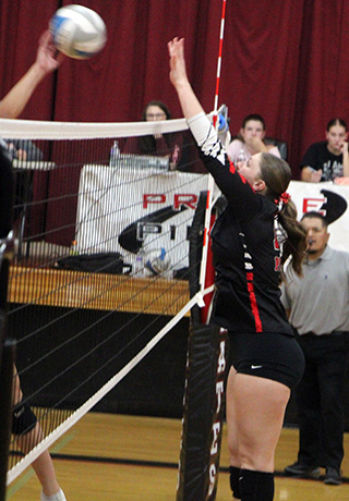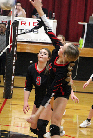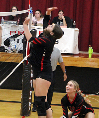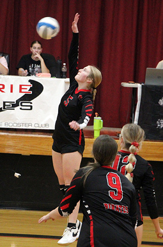 Lady Pirates season ends at District The Prairie Lady Pirates ended their regular season with a Senior Night win over Clearwater Valley, 25-10, 25-23, 26-28, 25-11 Tuesday, Oct. 14 at Cottonwood. On Saturday, Oct. 18, they opened District play at Genesee as the #6 seed and lost to #3 seeded Kamiah 11-25, 12-25, 21-25. They then played Kendrick in a loser-out match and won 25-10, 25-23, 18-25, 25-15. Finally on Monday, Oct. 20, they played Lapwai in a loser out match at the LCSC Activity Center and lost 17-25, 23-25, 25-14, 13-25 to end their season. Senior Night vs C.V. Seniors Kylie Schumacher, Avery Riener and Sierra Oliver were honored prior to the match against C.V.![]() In the match C.V. scored the first point on a missed Prairie serve, then Prairie scored the next 6. C.V. netted their serve then Kennedy Riener served 3 aces and Kylie Schumacher added a kill and a block for a 6-1 lead. At 7-3, Harlee Hansen scored a sideout kill and Erica Schlader followed with an ace. Hansen scored a block and a kill and Schlader added 2 mores aces for a 13-3 lead. C.V. got back within 15-7 then Kennedy Riener scored a kill, Hansen served an ace and Kylie Schumacher scored a kill for an 18-7 lead. After a sideout, Kylie scored a kill and Avery Riener served 2 aces to make it 21-8. A block and after a sideout a kill by Kylie Schumacher and a kill by Beka Schumacher gave Prairie the first set. C.V. bricked a serve to start the second set and Avery Riener served 2 aces for a 3-0 lead. C.V. then came back with 4 straight to take their first lead since it was 0-1 in the first set. Two sideouts later it was 4-5 when Kylie Schumacher scored a kill to tie. She then served Prairie to a 10-5 lead with 2 aces while Beka Schumacher scored 2 kills and Avery Riener added another. At 13-8, Hansen scored a sideout kill and then Kennedy Riener scored 2 kills and Beka Schumacher served an ace for a17-8 lead. C.V. then fought their way back to a 19-17 deficit before missing a serve. A kill by Kylie Schumacher, an ace by Avery Riener and an under the net violation gave Prairie a 23-17 lead. After a sideout, Kylie Schumacher scored on a push tom make it 24-18. C.V. then fought off 4 straight set points before bricking a serve to give Prairie a 25-22 win. In the third set new head coach Madison Shears put several subs in. Avery Riener served Prairie to a 4-0 lead with 4 aces. C.V. then answered back to take a 6-8 lead. They held the lead until Hansen served 3 straight aces to give Prairie a 13-12 lead. Prairie either held the lead or it was tied until it was 23-23. C.V. bricked a serve to give Prairie a match point chance. C.V. tied it with a tip and then took the lead. A kill by Halee Rowland tied it and an ace by Schlader gave Prairie another match point chance. A hitting error tied it and C.V. scored 2 kills to win and force a fourth set. C.V. then took leads of 0-3 and 1-4 before bricking a serve. Sierra Oliver then served 5 aces and Kylie Schumacher added a kill for an 8-4 lead. After a sideout, Beka Schumacher scored back to back kills and Kylie served an ace to make it 11-5. It was 13-9 when Schlader scored a kill and Hansen followed with 2 aces. Kennedy Riener added a kill and Tori Shears scored on a dig to make it 18-9. After 2 sideouts, Schlader scored a kill and Oliver then served out the match. Beka Schumacher had 2 kills, Kylie Schumacher added another and Oliver had 2 aces, including match point. For the match Kylie Schumacher had 11 kills, including 2 blocks with 3 assists and 4 aces. Beka Schumacher and Kennedy Riener each had 8 kills and 3 aces. Hansen had 6 kills, including a block, plus 1 assists and 8 aces. Schlader had 4 kills, 18 assists and 4 aces. Rowland had 4 kills. Avery Riener had 2 kills, 11 assists and 9 aces. Tori Shears had 2 kills and 1 assist. Bekah Shears had 1 kill. Oliver had 7 aces. Zoey Behler had 2 assists. Prairie ended their regular season with a record of 6-10, 6-8 in league play. They were in a 3-way tie for 4th in league but were the #6 seed to District due to Lapwai and Logos holding the edge in tiebreakers. The JV team ended their season with a 25-8, 25-16, 15-4 sweep of C.V. Faith Cash served Prairie to a 6-0 lead in the opening set with 4 aces plus 2 kills by Halee Rowland. Rowland served 3 aces to make it 10-3. Alli Rambo later served 5 straight for a 17-5 lead. She had 1 ace while Zoey Behler had 2 kills and Cash, Bekah Shears and Tinley Hibbard added 1 each. Shears served 4 straight, including 2 aces to give Prairie a 21-7 lead. Macie Uhlenkott wound up serving an ace for the set winning point. C.V. took a 0-4 lead in the second set but Rowland scored a sideout kill and Behler served 4 straight aces for a 5-4 lead. After a sideout by C.V., Behler scored a sideout kill and Rowland served 3 aces for a 9-5 lead. C.V. came back to tie it at 11 but a kill by Shears for the sideout and a kill each by Behler, Rambo and Shears made it 15-11. The set seesawed back and forth until Rowland served an ace and Audrey Warren added a kill to make it 24-15. C.V. fought of the first set point and then missed their serve to give Prairie the match. In the third set Cash served 2 aces to give Prairie the early lead. C.V. got back within 3-2 then Blake Uhlenkott scored a sideout kill. Macie Uhlenkott then served Prairie to a 12-2 lead with 6 aces plus a kill each by Mikayla Rowland and Blake Uhlenkott. After 2 points by C.V. Behler scored a sideout kill and Shears served out the match as Blake Uhlenkott and Molly Fowler each scored a kill. The C team ended their season with a 25-16, 25-7, 15-7 sweep of the Orofino C team. Vs. Kamiah at District In their opener at District Prairie fell behind Kamiah 1-9 to open the first set. Their only point was a kill by Schlader. After adding a kill by Beka Schumacher and another by Schlader, Kamiah came back with 5 straight to take a 3-15 lead.Prairie scored 4 straight points on a kill each by Avery and Kennedy Riener and Hanson plus an ace by Beka Schum
