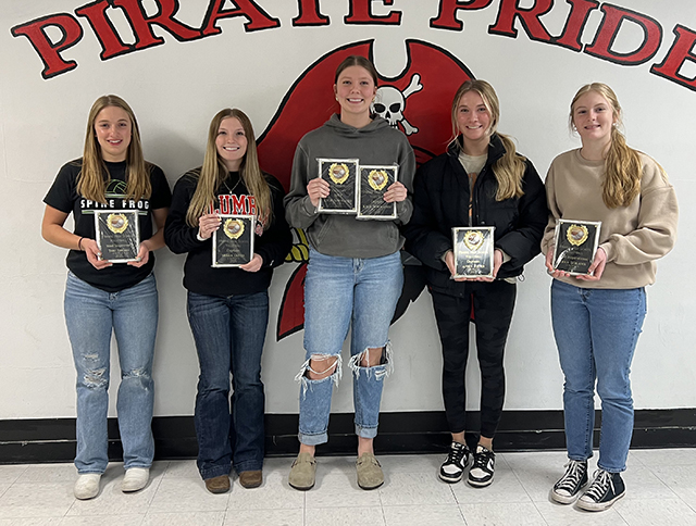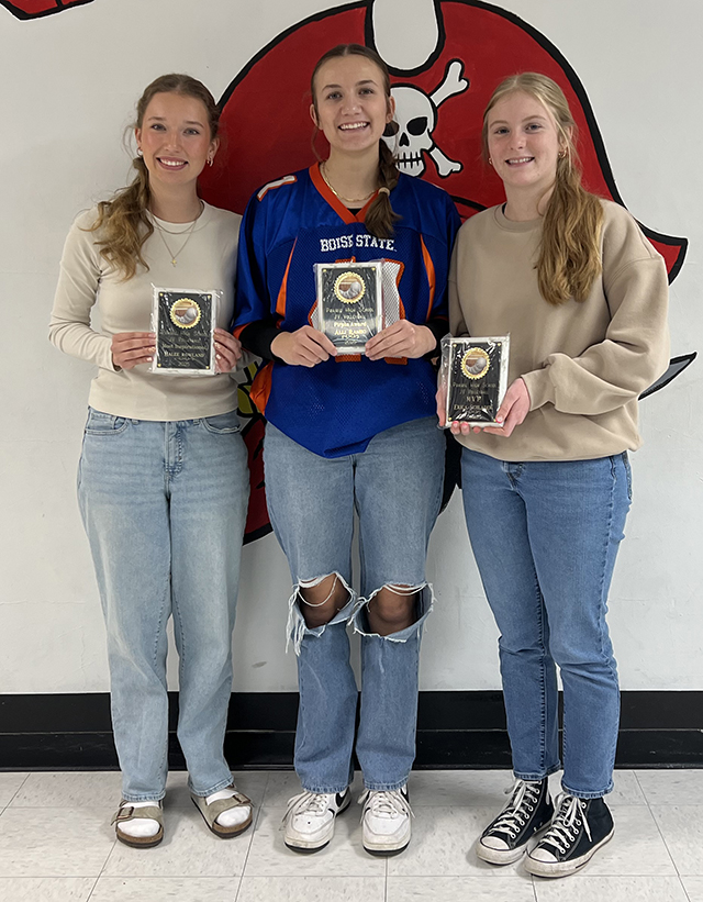Prairie JV volleyball award winners are shown. From left are Halee Rowland, most inspirational; Alli Rambo, Pirate Award and Erica Schlader, most valuable. Photo by Julie Schumacher. UPDATED PIRATES GIRLS BASKETBALL SCHEDULE FOR 2025-26