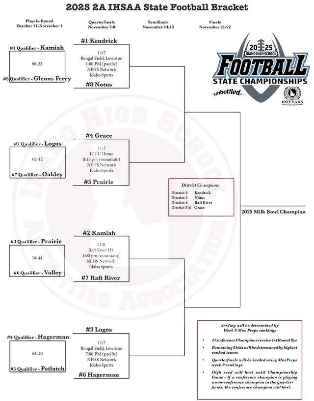 on to the quarterfinals. They will be making the long trip to Pocatello this week to play District 5-6 champion Grace at the ICCU Dome on Friday, Nov. 7, at 8:15 MST, 7:15 our time in the second game of a doubleheader. Tickets will need to be ordered ahead of time at idhsaa.org as no tickets will be sold at the gate. Grace is 8-1 on the season with their only loss coming to Adrian High School in Oregon. The only common opponent for the two teams is C.V. Grace won 62-8 against the Rams while Prairie defeated the Rams 56-6. Prairie last played Grace in last year’s state playoffs where they lost to the Grizzlies 38-48 at Cottonwood. ![]() This is the updated 2A bracket showing this week's games. |
