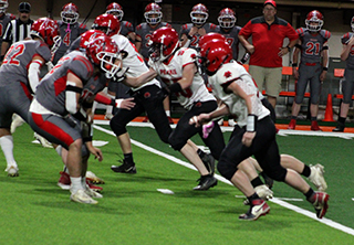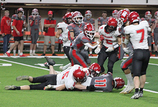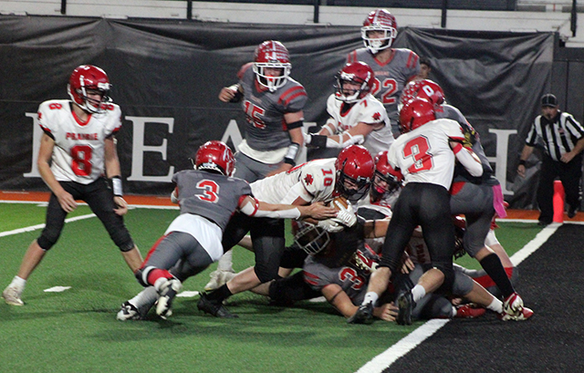 Defensively, the Pirates held the Grizzlies running game in check but struggled with the Grizzlies passing game. Grace received the opening kickoff and needed 10 plays to go 62 yards for the opening touchdown. That came on a 19 yard pass from quarterback Gavin Draper to running back Bryant Moss. Prairie wasn’t able to move the ball on their first possession and were hurt by a false start penalty. They punted and Grace took over at their own 39. The Pirates’ defense gave up a first down and then had Grace facing fourth and 7 at the Prairie 44. They went for it and Draper found Kade Kimball wide open for a 44 yard touchdown. They added a 2-point run for a 0-14 lead. Prairie picked up a first down on their next possession as Levi Gehring picked up 2 yards on third and 1. However that possession ended when Grace intercepted Kade Quintal’s pass at the Prairie 45 on the first play of the second quarter. They returned the ball 18 yards to the Prairie 27. Three plays later Grace scored again, this time on a 3 yard run. Lane Mader’s tackle stopped the 2-point play as Grace now led 0-20. Prairie had to punt again after facing and fourth and 20. Grace took over at their own 29. What followed was a bizarre possession where a penalty was called on 5 consecutive plays. 3 of those were on Grace which backed them up to their own 5 where they had a first and 34. Prairie then got flagged twice which moved the ball back out to the 25. Grace then had 2 incomplete passes and an 8 yard run that set up fourth and 6 from the 33. Grace decided to go for it and were stopped 1 yard short by the defense. Prairie took over at the Grace 38 and put together their first scoring drive. After an incomplete pass, Quintal picked up a first down on a 10 yard run. On second and 5 from the 23, Quintal passed down the left side to Cooper Riener for 20 yards to set up first and goal at the 3 yard line. Prairie tried running the ball 3 straight times setting up fourth and goal just inches from the goal line. Chris Schumacher was able to dive across the goal line on fourth down to put the Pirates on the scoreboard. Quintal passed to Gehring for the 2-pointer to make it 8-20. Grace answered right back with a 2-play 59 yard scoring drive. The touchdown came on a 48 yards pass from Draper to Parker Yost, their 6’5” tight end. Grace kicked the extra point to make it 8-27. Grace tried an onside kick with Payton Stamper recovering at the Prairie 47. Prairie picked up a couple of first downs as Quintal passed to Gehring for 9 yards to convert a second and 6. Schumacher then picked up 6 yards and Quintal passed to Levi McElroy for 7 yards for another first down at the Grace 27. Quintal picked up 4 yards on first down and after an incomplete pass, Grace was called for encroachment to set up third and 1. Prairie was unable to convert and turned the ball over on downs at the 18. Grace went for it again on fourth and 10 from their own 18. Schumacher batted the pass away and Prairie took over on downs with just seconds left in the half. Gehring was unable to gather in Quintal’s hail mary pass into the end zone as the half ended. Grace kicked off to start the second half and tried an onside kick. The ball only went 3 yards and Prairie took over on the Grace 43. The Pirates were unable to move the ball and turned it over on downs after gaining just 1 yard. Grace took over and picked up 4 first downs. The last set up first and goal at the 10. A holding penalty followed by a sack for a 6 yard loss by Trajan Elven set Grace back to the 26. They managed to get the ball down to the 12 before their fourth down pass was dropped. Prairie took over at the 12 and picked up a first down on a 10 yard pass to Riener. A third down sack for a loss of 7 led to a punt. Grace took over at the Prairie 44 and needed just 3 plays to score. Carter Kimball caught a 26 yard pass for the touchdown and Bradley Schiele kicked the extra point for an 8-34 lead. Prairie took over after a 19 yard kickoff return by Isaiah Warren at their own 32. Gehring caught a pass for 13 yards and then ran for 15 to move the ball to the Grace 40. Grace