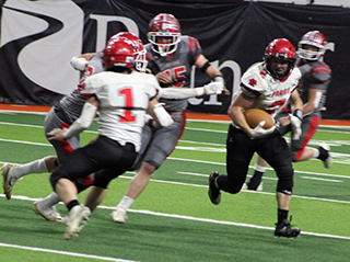 Warren again returned the kickoff 19 yards this time to the Prairie 29. Prairie picked up a first down on a 7 yard pass to Riener followed by a 15 yard pass to Gehring. An offensive interference call set them back. On that play McElroy got called for the penalty as he prevented another interception. Prairie picked up another first down on a 30 yard screen pass to the left to Gerhing. Gehring ran 4 yards on first down. After 2 incomplete passes, Prairie converted a first down on an 8 yard pass to Schumacher. After 2 runs netted 0 yards, Quintal passed over the middle to Gehring for 22 yards and a touchdown. Quintal then passed to Mader for the 2-pointer to make it 16-40 with 7:21 left to play. Prairie got a chance to get closer when Gehring intercepted Draper’s pass at the Prairie 40 and returned it to the 46. However a sack and then Quintal’s third interception ended that chance. Grace took over at their own 35 and was able to pick up a first down which allowed them to run out the clock. Prairie’s running attack was stifled as they picked up just 38 yards on 25 attempts. Gehring had 39 yards on 13 carries. Quintal completed 13 of 29 passes for 149 yards with 3 interceptions. Gehring caught 6 passes for 88 yards. Riener caught 3 for 37. McElroy caught 2 for 11. Schumacher caught 1 for 8 and Stamper caught 1 for 5. Grace had 75 yards rushing on 25 attempts. Their big damage came in the passing game as Draper completed 22 for 34 passes with 1 interception for 324 yards. On defense Mader had 5 solo tackles, 5 assists and 2 sacks. Schumacher had 6 solos and 4 assists. Gehring had 4 solos, 4 assists and an interception. McElroy had 5 solos and 2 assists. Stamper had 3 solos and 3 assists. Quintal had 2 solos. Elven had 1 solo, 1 assist and 1 sack. Ben Secrest had 2 assists and 1 sack. Ashton Martin had 1 assist and 1 sack. Riener and Oliver Kauffman-VanHouten each had 1 solo. Prairie ends their season with a record of 7-4. Their 4 losses were to the 4 teams that are in the state semifinals: Kendrick, Logos, Kamiah and Grace. Prairie 0 8 0 0 - 6 Grace 14 13 7 6 -40 G-Moss 19 pass from Draper (pass failed) 7:15 1st G-K. Kimball 44 pass from Draper (C. Kimball run) 2:25 1st G-Smith 3 run (run failed) 10:34 2nd P-Schumacher 1 run (Gehring pass from Quintal) 3:46 2nd G-Yost 48 pass from Draper (Schiele kick) 3:23 2nd G-C. Kimball 26 pass from Draper (Schiele kick) 1:56 3rd G-Meacham 24 pass from Draper (kick failed) 11:54 4th P-Gehring 22 pass from Quintal (Mader pass from Quintal) 7:21 4th ![]() Cooper Riener, 3, blocks out a defender allowing Chris Schumacher, 10, to dive into the end zone with Prairie’s first touchdown against Grace. At left is Kade Quintal and #7 is Levi McElroy. ![]() The 3 senior captains go out for the coin toss for their final time. From left are Levi Gehring, Chris Schumacher and Levi McElroy. ![]() Lane Mader with the ball in the end zone after catching his third 2-pointer in the last two games. ![]() Chris Schumacher carries the ball against Grace. Blocking for him is Max Rehder. Behind him is Kade Quintal who had just handed him the ball. ![]() The Prairie defensive front engages with the Grace offensive line at the start of a play. Shown from left are Trajan Elven, Ben Secrest, Lane Mader and Ashton Martin. ![]() Levi Gehring runs the ball to his left as Lane Mader blocks. ![]() Trajan Elven and Ben Secrest tackle a Grace ball-carrier in their state playoff game at Pocatello. Also shown are Payton Stamper, Levi Gehring and Levi McElroy. PIRATES BOYS FOOTBALL SCHEDULE FOR 2025