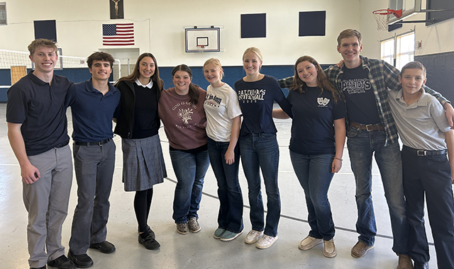 St. John Bosco student government members are pictured with Toby Forsmann's mom Amy after presenting her with a check for the funds raised to help with Toby’s treatments. From left are Tommy Rose, Cody Weckman, Savannah Perrin, Amy Forsmann, Madeline Wassmuth, Catherine Seubert, Miah Mager, Nathan Wassmuth and Kolby Nuxoll. Photo by SJBA.