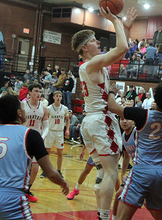 the end of the first quarter. Kendrick scored to make it 6-23 then Prairie put together a 19-3 run to cut their deficit to just 1 at 25-26.Shears hit a short jumper from the side. Schwartz then made back-to-back 3’s. Schlader scored a putback and Shears hit a 3 for a 13-0 run that cut the lead to 4 at 19-23. After a 3 by Kendrick, Forsmann hit back to back lay-ups and Shears scored from 16 feet to cut the lead to 1 with 1:40 left in the half. Kendrick then broke the momentum with back-to-back 3’s. Shears was fouled on a 3-point attempt at the end of the half and hit 2 of 3 at the line to make it 27-32 at halftime. Kendrick pushed the lead back to 10 in the third quarter with a 2-7 run. Schlader’s putback was Prairie’s only points. Prairie then put together a 14-0 run to take their first lead of the game. Schlader started it with a 3 and than a lay-up. Forsmann made 2 free throws and Gehring hit a 3 to tie it at 39. Schwartz hit a lay-up to give Prairie the lead and Forsmann added a lay-up to make it 43-39. Kendrick then broke the run to make it 43-41 after 3 quarters. The end of the quarter may have been the worst thing to happen to the Pirates as it gave the Tigers a chance to gather themselves. Kendrick outscored the Pirates 19-4 in the fourth quarter to win going away. Gehring and Shears each scored a basket for Prairie but a 0-8 run to start the quarter and a 0-9 run to end it gave Kendrick the win. Schlader had a double-double to lead the Pirates with 13 points and 17 rebounds. Shears added 11 points while Schwartz and Forsmann scored 8 each hand Gehring had 7. Each team played just 6 players with VonBargen being Prairie’s only sub. Prairie had a 39-26 edge on the boards. Schlader had 2 steals and 3 assists. Schwartz led in assists with 4 while Forsmann added 3. Prairie was 19 for 56 from the field, 34%, and 4 for 5 at the line, 80%. Kendrick was 21 for 47 from the field, 45%, and 10 for 19 at the line, 53%. Prairie is now 8-3 overall and 5-1 in league play. Kendrick also won the JV game 34-49. Kendrick started the game 0-6. Quintal then hit a baskets and 2 free throws to make it 4-6. Kendrick then scored 12 straight to end the quarter with a 4-18 lead. Kendrick scored the first 2 of the second quarter. Riener then drove for a lay-up. After another Kendrick basket Sam Rehder drove for a lay-up. Quintal scored a free throw and labrum added a basket to cut the lead to 11 at 11-22. Each team scored 4 the rest of the half with Rehder and Quintal each scoring for Prairie. Kendrick led 15-26 at the half. Kendrick opened the third quarter with 6 straight points and eventually led by 18 at 19-37. Prairie then closed the third quarter with a 10-2 run to get back within 10 at 29-39. Quintal had a 4-point play as he got fouled on a made 3. Forsmann scored a putback, Riener a 3 and Quintal a lay-up to end the quarter. Riener made 2 free throws to get the lead down to 8 early in the fourth. However Kendrick outscored Prairie 3-10 the rest of the way. Quintal scored 15 to lead the Pirates. Riener scored 9, Rehder 6 and Labrum and Forsmann 2 each. Kendrick had a 29-33 rebounding edge. Forsmann and Labrum each had 9 to lead Prairie. Riener had 4 steals and Rehder and Forsmann each had 1 assist. Prairie was 13 for 51 from the field, 25%, and 7 for 9 at the line, 78%. Kendrick was 20 for 50 from the field, 40%, and 6 for 11 at the line, 55%. Kendrick’s Morgan Boyer dominated the game with 25 points and 16 rebounds. Prairie 6 21 16 4 -47 Kendrick 21 11 9 19 -60 Prairie-Gehring 3-8, 0-0, 7; Shears 4-16, 2-3, 11; Schwartz 3-8, 0-0, 8; Schlader 6-12, 0-0, 13; Forsmann 3-11, 2-2, 8; VonBargen 0-1, 0-0, 0. 3-pointers-Schwartz 2, Gehring, Schwartz, Schlader. Kendrick-M. Kirkland 5-7, 1-3, 11; Silflow 1-4, 1-3, 3; Roetcisoender 7-13, 2-3, 19; Tweit 7-17, 2-5, 20; H. Kirkland 1-5, 4-4, 6; Koepp 0-1, 0-0, 0. 3-pointers-Tweit 4, Roetcisoender 3. ![]() Levi Gehring in the lane against Lapwai. ![]() Patrick Schlader goes up for a shot against Lapwai. Also shown are Max Rehder and Phil Schwartz. ![]() Phil Schlader handles the ball against Lapwai. ![]() Chase VonBargen looks to pass against Kendrick.